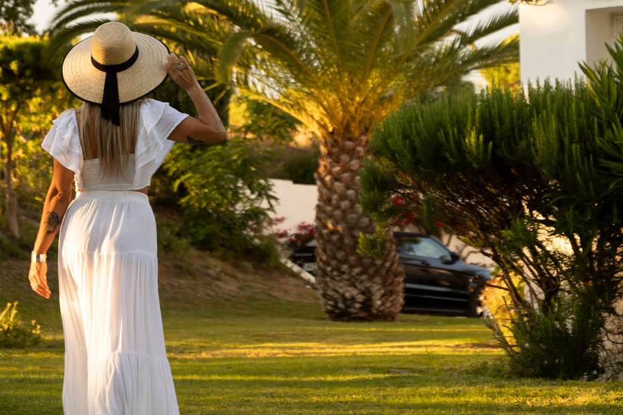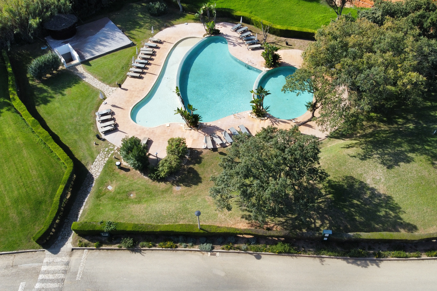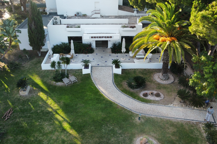 Todo o espaço, o cuidado com os espaços exteriores, jardins e piscinas.